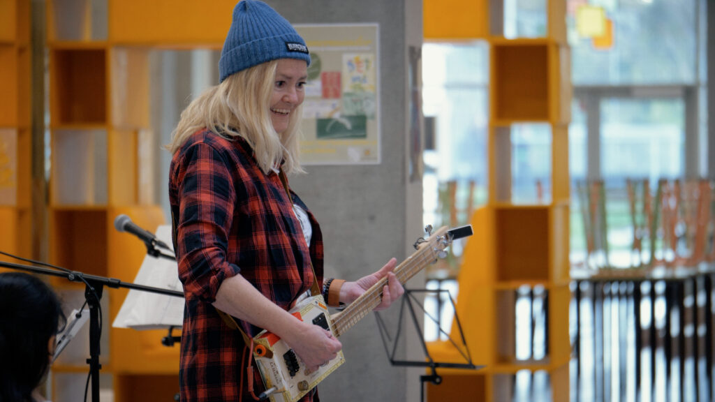 Hvordan: I forløbet vil de deltagende pædagoger samme dag, hvor Lisbeth er i dagtilbuddet både få ”voksenundervisning” af Lisbeth i at spille guitaren og efterfølgende samarbejde med Lisbeth i praksis, hvor de udvikler, skræddersyr og målretter brugen af cigarkasseguitaren, sang og musik i dagtilbuddets hverdagspraksis. Forløbet kobler hermed musikalsk læring med daglig praksis og giver personalet redskaber til at bruge cigarkasseguitaren som en naturlig del af det pædagogiske arbejde.